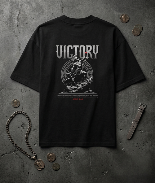 Design: Minimalistischer Front-Print & detailreicher "VICTORY" Back-Grafikdruck.